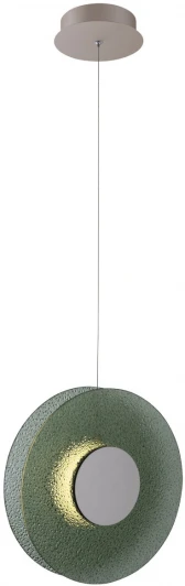Металлическое основание подвеса гальванизировано в цвет никеля. Корпус плафона выполнен из сплава алюминия с цинком и гальванизирован в цвет основания. Светодиодные источники света закрыты матовым акрилом. Подвес декорирован фактурным стеклом, окрашенным в массе в зеленый цвет.