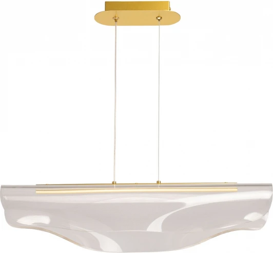 Металлическое основание подвесной люстры гальванизировано в цвет латуни. Корпус плафона выполнен из сплава алюминия с цинком и гальванизирован в цвет основания. Светодиодный источник света закрыт прозрачным акрилом с точечным рисунком.