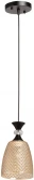 Металлическое основание окрашено в черный цвет. Традиционный источник света закрыт стеклянным фактурным плафоном, гальванизированным в цвет янтаря. Подвес декорирован прозрачным акрилом.