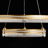 Металлическое основание светильника гальванизировано в цвет золота. Корпус плафона выполнен из сплава алюминия с цинком и обработан по технологии порошкового окрашивания в цвет матового золота. Светодиодные источники света закрыты белым силиконом. Люстра декорирована пластинами из прозрачного акрила с линейным рисунком.