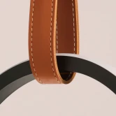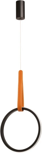 Металлическое основание подвеса окрашено в черный цвет. Корпус плафона выполнен из сплава алюминия с цинком и окрашен в цвет основания. Светодиодные источники света закрыты белым матовым акрилом. Подвес декорирован держателем из экокожи коричневого цвета.