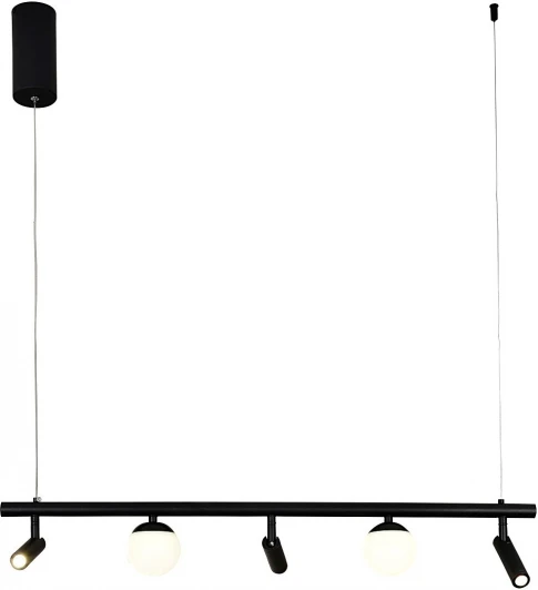Каркас черного цвета цилиндрической формы, в который вмонтированы источники света двух типов - стационарные плафоны в форме шара, и поворотные споты, оснащены дистанционным пультом управления.
