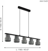 Подвесной светильник Eglo Hilcott 39855 от австрийского производителя Eglo исполнен в сером цвете из металла. Модель имеет 5 плафонов из металла и подходит для размещения на потолке в гостиной, кафе, кухне, над кухонным островом, офисе в стиле лофт. Лампочки с цоколем 6xE27 обладают мощностью 240W и освещают площадь до 48 кв. м. Питание от сети 220V. Дополнительные опции: регулировка высоты, возможность подключения диммера. Монтаж производится на пластину. Длина — 1160 мм, ширина — 145 мм, высота — 1100 мм. Заказывайте Eglo 39855 онлайн по низкой цене с гибкими условиями доставки на Fedomo.ru!