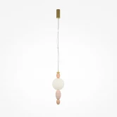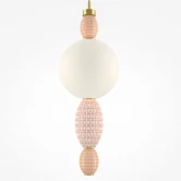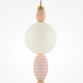 Металлическая арматура цвета латуни. Плафоны из белого стекла для мягкого, равномерного освещения, декоративные элементы из цветной керамики. Угол рассеивания 120°. Цветовая температура – 3000 К. Регулируемый провод длиной 3 м.
