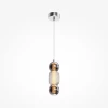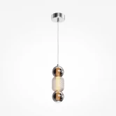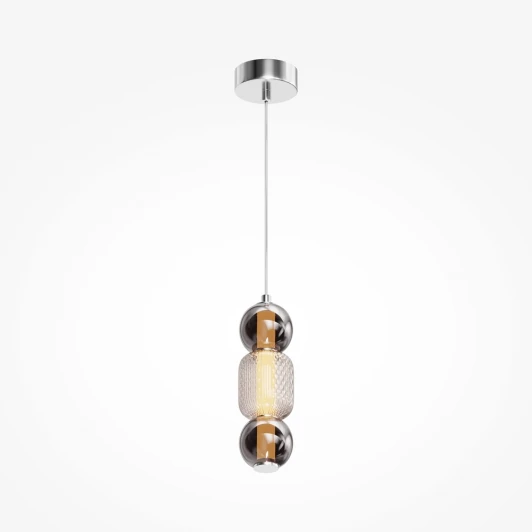 Материал арматуры - металл, цвета - золото, хром. Микс плафонов: гладкие cферы коньячного или дымчатого оттенка + округлые рельефные с ромбовидным узором из прозрачного стекла. Регулируемая высота подвесных моделей - максимальная длина провода 3 метра. LED-источник света, цветовая температура 3000К