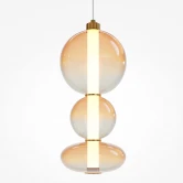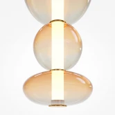 Светильники с тонированными выдувными стеклянными плафонами (дымчатыми или янтарными) и металлической арматурой (черной или цвета латуни). Окрашивание плафонов градиентное. Источник света: LED. Световой элемент установлен внутри акрилового рассеивателя. Цветовая температура источника света – 3000К, угол рассеивания — 120°. Торшеры снабжены Push-кнопкой на проводе.