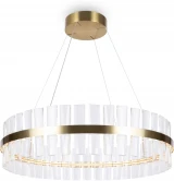Материал арматуры - металл, цвет - латунь. Декор - объемные прозрачные хрустальные элементы с чередующимся рисунком. LED источник света, цветовая температура - 3000К. Регулируемая длина тросов.