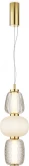 Металлическая арматура, цвет - золото, хром. Микс плафонов округлых и вытянутых форм из белого матового и прозрачного стекла с сетчатым и с линейным повторяющимся рельефным рисунком. Регулируемая высота подвесных моделей, провод - 3 метра. LED-источник света, цветовая температура 3000К.