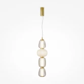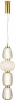 Металлическая арматура, цвет - золото, хром. Микс плафонов округлых и вытянутых форм из белого матового и прозрачного стекла с сетчатым и с линейным повторяющимся рельефным рисунком. Регулируемая высота подвесных моделей, провод - 3 метра. LED-источник света, цветовая температура 3000К.