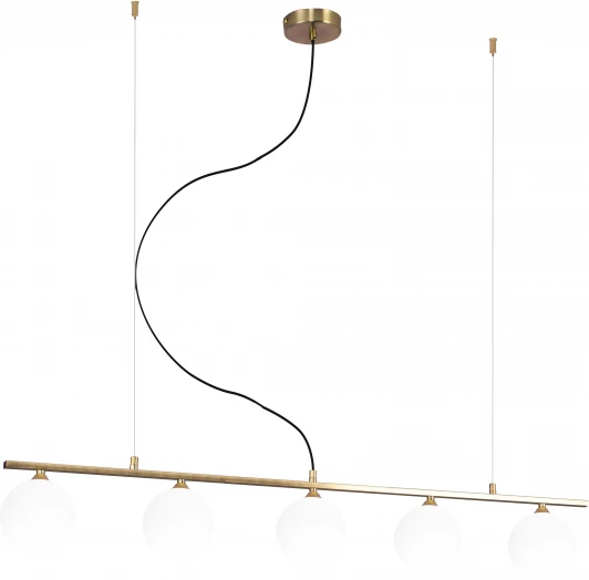 Подвесной светильник Sector V3080-5P от итальянского бренда Moderli исполнен в цвете латунь из металла, имеет 5 плафонов из стекла. Светильник подходит для размещения на потолке в гостиной, кафе, кухне, над кухонным островом, офисе в современном стиле. Лампочки с цоколем 5xG9 с мощностью 150W освещают площадь до 22 кв. м. Напряжение питания 220V. Монтаж производится на пластину. Срок службы ламп составит до 50000 ч. Габариты: длина — 1180 мм, ширина — 100 мм, высота — 1200 мм. Заказывайте Moderli Sector V3080-5P онлайн по низкой цене с гибкими условиями доставки на Fedomo.ru!