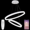 Диаметр плафонов 60 см и 40 см. Светодиодный светильник с пультом ДУ, моб приложением для управления со смартфона, планшета. Светильник имеет круглую, кольцеобразную форму с эстетическим дизайном нимб. По периметру располагается контурное свечение, благодаря которому светильник подойдёт в любой интерьер. Высота люстры регулируется, можно настроить нужный наклон нимба. Люстра имеет тёплый, естественный и холодный свет с регулировкой температуры свечения. Обладает плавной настройкой яркости в диапазоне от 10% до 100%. Имеется режим ночника и таймер отключения. От стандартного выключателя люстра имеет 4 режима свечения. Общая мощность 140W со световым потоком 11500 lm позволяет осветить до 26 кв.м. Он прост в сборке, установке и экономичен в обслуживании. Светодиоды легко заменимы в случае перегорания. Люстра подойдёт для всех видов потолков. Цветовая температура настраивается от 2700 до 7000 K. Степень защиты 20 IP.