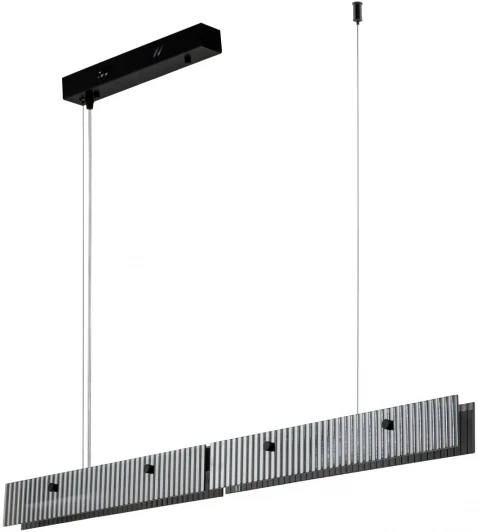 Подвесной светильник серии Lucen имеет металлическую арматуру, окрашенную в черный цвет и рифленый плафон из стекла прямоугольной формы, гальванизированного в дымчатый цвет. Подвесной светильник комплектуется пультом дистанционного управления 2,4G и драйвером высокого качества с европейским стандартом TV. Пульт дистанционного управления обеспечивает переключение трех режимов световой температуры и диммирование.