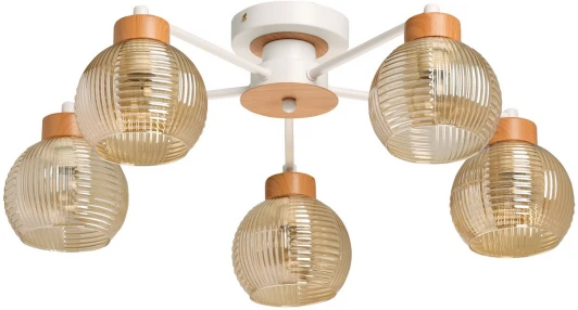 Металлическое основание потолочной люстры окрашено в белый цвет. Фактурные стеклянные плафоны, гальванизированные в цвет коньяк, выдуваются в форму вручную. Люстра декорирована металлическими элементами, имитирующими светлое дерево по технологии иммерсионной печати.