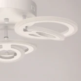 Металлическое основание потолочной люстры окрашено в белый цвет. Корпус плафона выполнен из сплава алюминия с цинком и окрашен в цвет основания. Светодиодные источники света закрыты белым матовым акрилом. Светильник приходит в состоянии частичной сборки в компактной упаковке: вся электрика подсоединена, достаточно закрепить плафоны на корпусе.
