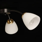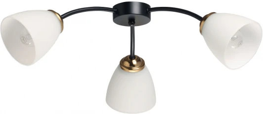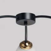 Металлическое основание потолочной люстры окрашено в черный цвет. Отдельные элементы основания гальванизированы в цвет латуни. Стеклянные плафоны матированы и окрашены в белый цвет изнутри.