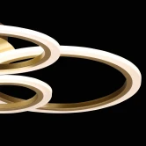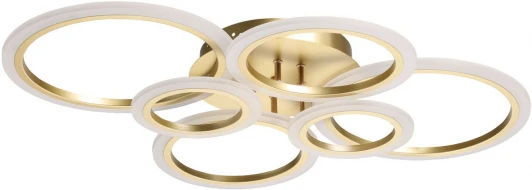 Металлическое основание потолочной люстры окрашено в матовое золото. Корпус плафона выполнен из сплава алюминия с цинком и окрашен в цвет основания. Светодиодные источники света закрыты белым матовым акрилом.