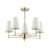 Потолочная люстра Lumion Doris 4436/5C сочетает лаконичность современных решений и утонченность классической эстетики. Её выразительные геометрические линии и плафоны в форме конуса отражают тенденции минимализма и функционализма в интерьере, подчеркивая актуальность дизайна. Текстильные белые абажуры создают мягкий, рассеянный свет, визуально расширяя пространство и привнося уют. Металлическое основание с зеркальной поверхностью в золотистом цвете подчеркивает престижность и стиль, а также позволяет люстре гармонично сочетаться с различными интерьерными концепциями. Использование Lumion Doris 4436/5C эффектно дополнит современный интерьер гостиной, спальни или столовой, сделав комнату привлекательной и утонченной.