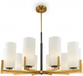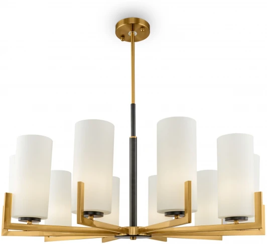 Арматура из металла, оттенок — латунь. Стеклянные плафоны в белом цвете. Часть элементов окрашена в контрастный черный оттенок. Геометрия в дизайне: цилиндрические плафоны, прямоугольные рожки.