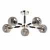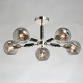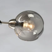 Основание светильника выполнено из металла и гальванизировано в цвет хрома с последующим матированием. Декоративные элементы на рожках окрашены в черный цвет. Светильник декорирован стеклянными плафонами, отлитыми в сложную форму и гальванизированными в дымчатый цвет.