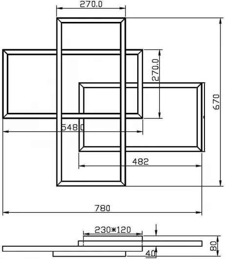 Металлическая арматура, оттенки — белый и черный. Матовый акрил скрывает интегрированные LED-источники. Геометричный дизайн: конструкция состоит из наложенных друг на друга прямоугольников.