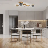 Компактное металлическое основание и арматура цвета латуни. Две модели с плафонами белого цвета и две с разноцветными плафонами: серый, прозрачный, дымчатый и оттенка коньяка. Источник света: цоколь Е14. Компактное основание светильника прилегает к потолку. Функциональное основное освещение. Местоположение разноцветных плафонов можно менять, создавая композиции по своему вкусу. Поверхность плафонов имеет орнамент, при включении светильника на потолке создаются узоры.