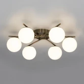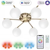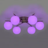 Люстрой можно управлять: из приложения на смартфоне по Wi-Fi при наличии интернета, с помощью голосовых помощников Алиса, Маруся, Салют, а также пультом дистанционного управления и настенным выключателем. Можно легко настроить работу по сценариям и расписанию. Люстра шестирожковая с круглым основанием. Корпус металлический, цвет - благородная бронза. Плафоны в форме шара, изготовлены из матового оптического полимера. Внутри каждого плафона расположена уникальная светодиодная панель, обеспечивающая яркое основное освещение или красочную RGB подсветку, с плавной регулировкой яркости во всех режимах света. Цветовая температура основного света регулируется в диапазоне от 3000К до 5500К, позволяя настроить любые оттенки теплого, нейтрального или холодного света. Мощность 70Вт, световой поток 7500Лм. Радиопульт ДУ в комплекте. Питание пульта - 2 батарейки тип ААА, напряжением 1,5V (в комплект не входят).