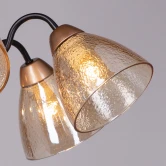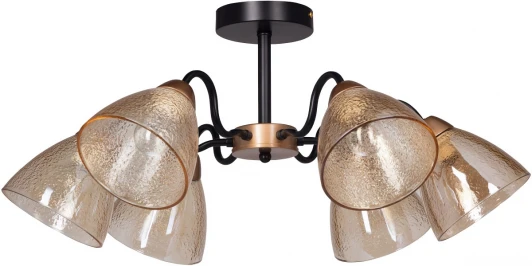 Металлическое основание потолочной люстры окрашено в черный цвет. Отдельные элементы основания гальванизированы в цвет золота. Потолочная люстра декорирована плафонами из фактурного стекла, гальванизированного в цвет коньяк.