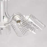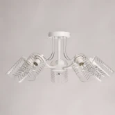 Металлическое основание потолочной люстры окрашено в белый цвет. Отдельные элементы основания гальванизированы в цвет хрома. На прозрачные стеклянные плафоны вытянутой формы нанесен геометричный орнамент.