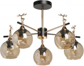 Металлическое основание потолочной люстры окрашено в черный цвет. Отдельные элементы основания гальванизированы в цвет золота. Выдувные вручную стеклянные плафоны гальванизированы в цвет шампань. Люстра декорирована оригинальными фигурками оленей, выполненными из сплава алюминия с цинком по технологии художественного литья и гальванизированными в цвет золота.
