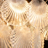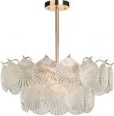 Металлическое основание потолочной люстры гальванизировано в цвет золота. Люстра декорирована пластинами из прозрачного фактурного стекла в форме ракушек.