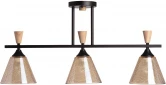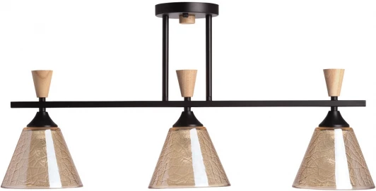 Металлическое основание потолочной люстры окрашено в черный цвет. Стеклянные плафоны отлиты в фактурную форму и гальванизированы в цвет коньяка. Потолочная люстра декорирована элементами из светлого натурального дерева.