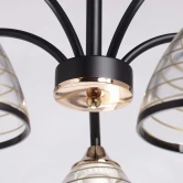 Металлическое основание потолочной люстры окрашено в черный цвет. Отдельные элементы основания гальванизированы в цвет золота. На прозрачные стеклянные плафоны нанесены тонкие полоски цвета золота. Нижний край плафонов отделан кантом черного цвета.