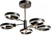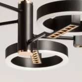 Металлическое основание подвесной люстры окрашено в черный цвет. Отдельные элементы основания гальванизированы в цвет золота. Корпус плафонов выполнен из сплава алюминия и окрашен в цвет основания. Светодиодные источники декоративного света закрыты матовым акрилом. Открытые функциональные точечные светодиоды углублены в корпус плафонов.