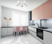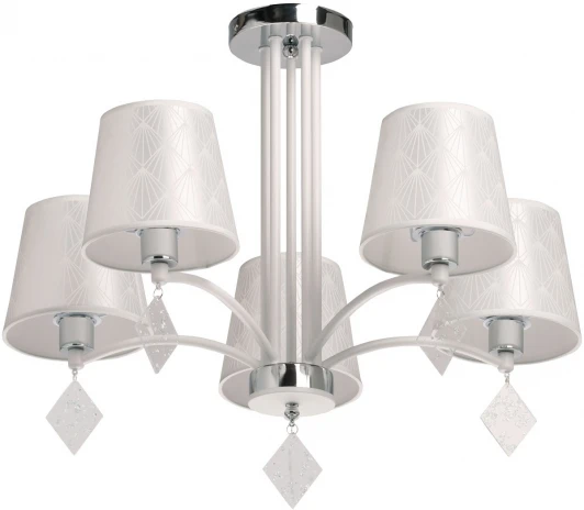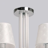 Металлическое основание люстры окрашено в белый цвет. Отдельные элементы основания гальванизированы в цвет хрома. Традиционные источники света закрыты атласными абажурами белого цвета с геометричным рисунком. Абажуры прошиты и отделаны белым кантом. Люстра декорирована подвесками из фактурного прозрачного акрила.