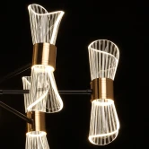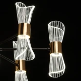 Металлическое основание люстры окрашено в черный цвет. Отдельные элементы основания гальванизированы в цвет золота. Светодиодные источники света закрыты оригинальными плафонами из прозрачного литьевого акрила.