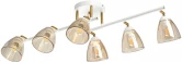 Металлическое основание потолочного светильника окрашено в белый цвет. Отдельные элементы гальванизированы в цвет матовой бронзы. Стеклянные плафоны гальванизированы в цвет шампань.