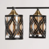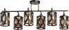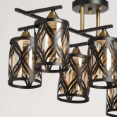 Металлическое основание потолочной люстры окрашено в черный цвет. Отдельные элементы основания гальванизированы в цвет античной бронзы. Металлические плафоны окрашены в черный цвет. Внутренние стеклянные плафоны гальванизированы в цвет шампань.
