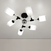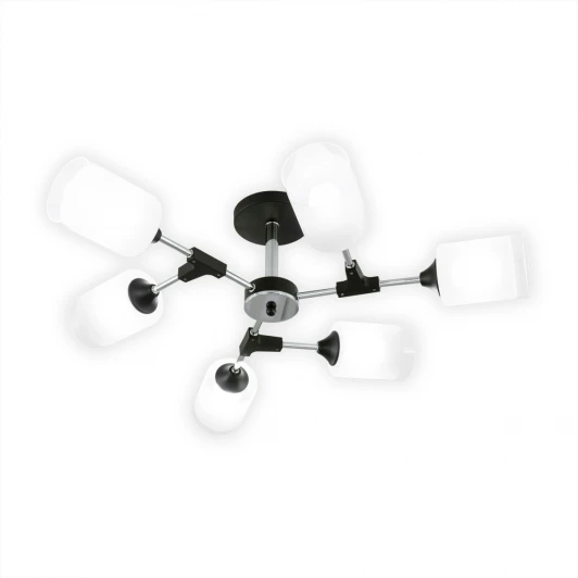Корпус светильника металлический, чёрного цвета, с декоративными хромированными элементами. Основание круглой формы, рожки-штанги расположены параллельно потолку. Плафоны стеклянные, цилиндрической формы, полуматовые с прозрачной окантовкой. В изделии 6 ламп с цоколем Е27, максимальной мощностью 60Вт. Светодиодные лампы можно использовать более яркие. Поставляется в компактной упаковке, в виде набора для самостоятельной сборки. Крепёж и подробная инструкция в комплекте. Подходит для всех типов потолков, в том числе натяжных, тип крепления – планка.