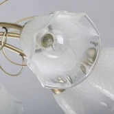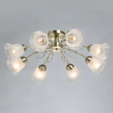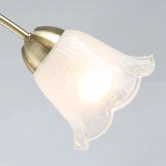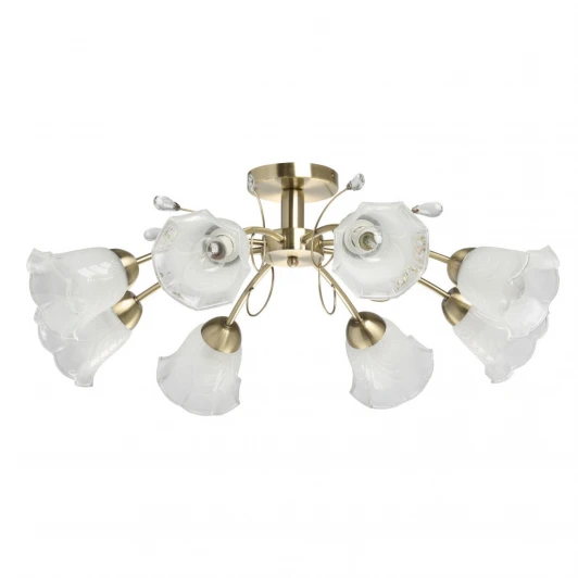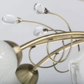 Металлическое основание потолочного светильника гальванизировано в цвет античной бронзы. Стеклянные плафоны отлиты в сложную форму и матированы. Светильник декорирован хрустальным стеклом миндальной формы.