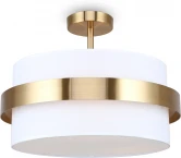 Металлическая арматура, цвет - латунь. Круглый широкий праздничный абажур из ткани белого цвета. Декоративная парящая окантовка из металла в цвет арматуры. Регулируется по длине. Компактные размеры подходят для низких потолков и небольших интерьеров. Источник света — лампа с цоколем Е14.