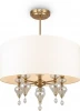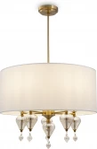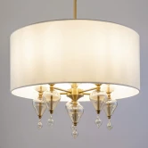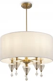 Арматура из металла, цвет — латунь. Плафоны — тканевые, молочного цвета. Металлическая конструкция декорирована выдувными стеклянными элементами с перламутровым напылением. Источником света служит лампа с цоколем Е14.