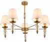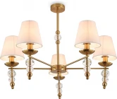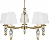 Материал абажура — ткань, цвет — белый. Металлическая арматура в цвете латунь обрамлена хрустальными бусинами. Источник света — лампы с цоколем Е14. Степень защиты — IP20.