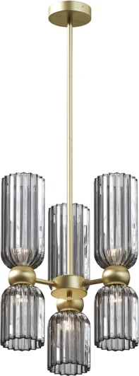 Металлическая арматура в цвете золота. Плафоны стеклянные нескольких цветов: коньячный, дымчатый, белый, серый. Источник света: цоколь Е14. Высота регулируется сегментами штанги или с помощью трехметрового провода. Серия применима в помещениях с высокими потолками. Поверхность стеклянных плафонов рифленая, усиливающая световые эффекты.