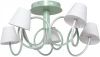 Металлическое основание потолочной люстры окрашено в зеленый цвет. Корпус плафонов изогнутой формы выполнен из сплава алюминия с цинком и окрашен в цвет основания. Двухслойные абажуры состоят из текстиля белого цвета и термостойкого акрила с внутренней стороны. Абажуры прошиты. Светодиодные источники света закрыты белым силиконом.