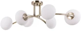 Трендовый дизайн потолочной люстры составляет подчеркнутая геометрия. Матовые плафоны создают комфортное освещение. Заменяемые источники света удобны в эксплуатации. Компактный размер светильника подходит для стандартных потолков. Светильник вытянут горизонтально, благодаря чему он освещает большую площадь. Металлическое основание потолочного светильника гальванизировано в цвет античной бронзы. Светильник декорирован стеклянными плафонами белого цвета.