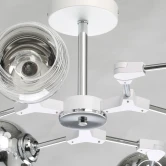 Металлическое основание потолочного светильника гальванизировано в цвет хрома. Отдельные элементы окрашены в белый цвет. Светильник декорирован прозрачными стеклянными плафонами, гальванизированными в цвет хрома у основания. На плафоны нанесен рисунок белой краской в виде параллельных полос. Модный дизайн в виде молекулы привлекает внимание Цвет хрома делает светильник универсальным в современный интерьер Потолочная люстра сохраняет пространство комнаты. Плафоны, направленные в разные стороны создают яркое освещение. Качественная электрика делает люстру безопасной