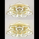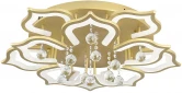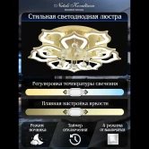 Светодиодный светильник с дистанционным управлением через пульт ДУ, смартфон, планшет. Лицевую часть составляют равноудалённые друг от друга рожки с симметричным дизайнерским узором, выполненные из акрила и располагающиеся на двух уровнях. Это обеспечивает отличное и равномерное рассеивание света. Стеклянные подвески эффектно преломляют свет, дополняя данную модель. Дизайн люстры выполнен в современном стиле в золотом цвете и отлично подойдёт в любой интерьер. Люстра имеет тёплый, естественный и холодный свет с регулировкой температуры свечения. Обладает плавной настройкой яркости в диапазоне от 10% до 100%. Имеется режим ночника и таймер отключения. Кроме того, от стандартного выключателя люстра имеет 4 режима свечения.