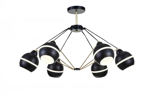Потолочный светильник из металла матового черного цвета, с акриловой, пропускающей свет, вставкой в плафонах и тонкими элементами матового золота. 6хЕ14