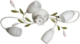 Основание светильника выполнено из металла и обработано по технологии хай-лайт, где основной цвет белый и декоративный слой золотого цвета. Плафоны из стекла отлиты в сложную форму и окрашены изнутри в белый цвет. Декоративные элементы в виде листьев окрашены в зеленый цвет. Декор в виде бутонов выполнен из фарфора и окрашен в розовый цвет. Актуальный дизайн флористической тематики.Ручной работы изящные керамические бутоны.Декоративный элемент в основании из металла белого цвета с золотистой патинойМягкий свет за счет матированных рельефных плафонов.Компактная высота идеальна для стандартной высоты потолка.