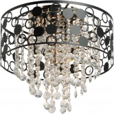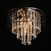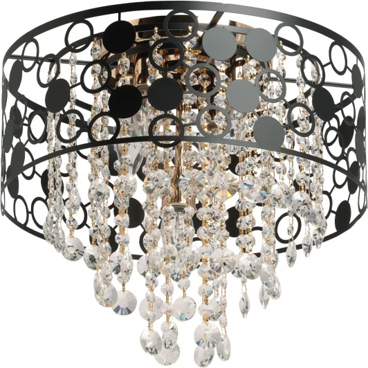 Металлическое основание светильника гальванизировано в цвет золота. Металлический плафон с геометричным орнаментом, выполненным по технологии лазерной резки, окрашен в черный цвет. Люстра декорирована прозрачным хрусталем круглой формы.